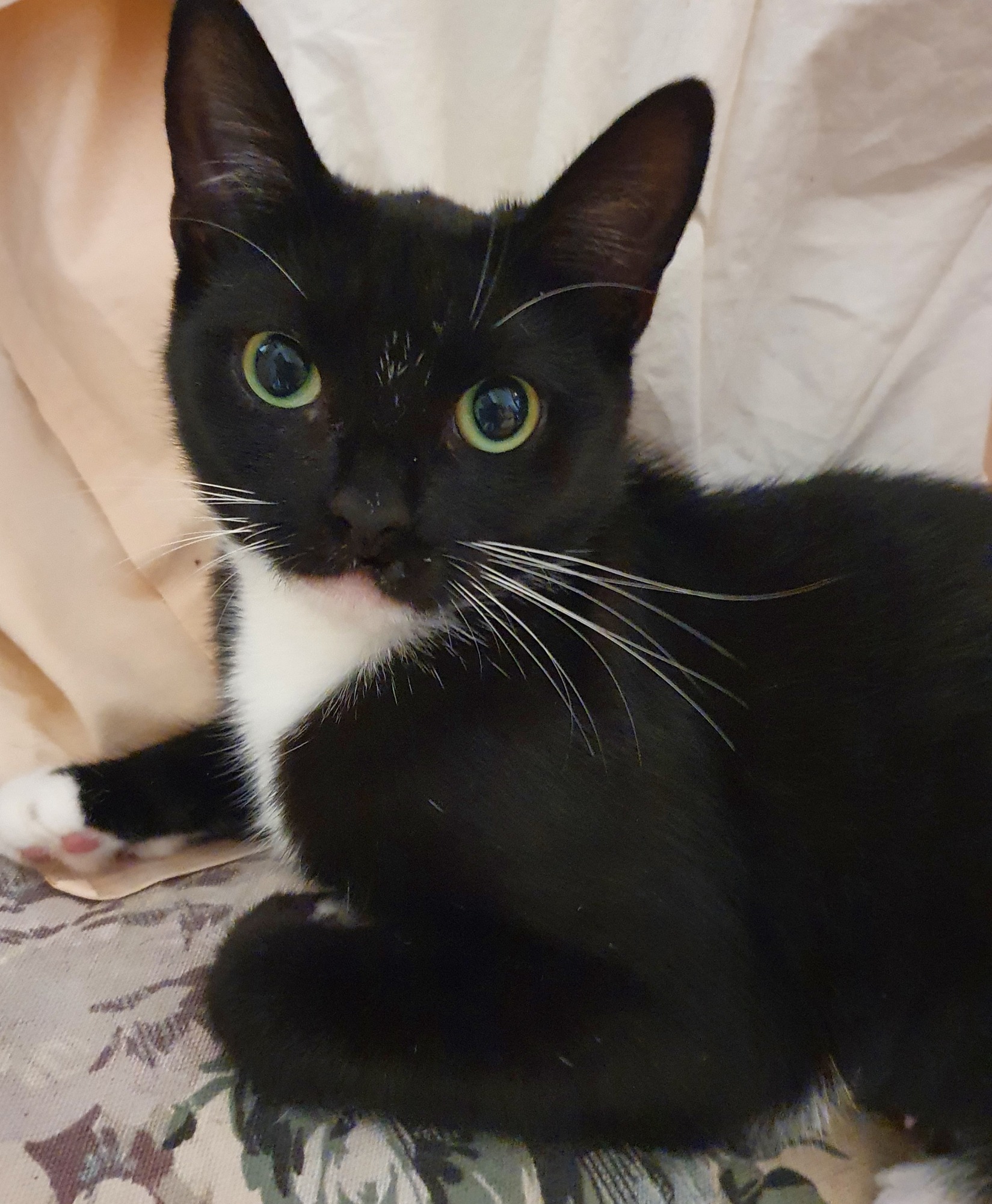 When Sabrina was rescued she was a skinny little thing who had been valiantly caring for her litter of kittens. Since being in care she has flourished and is now looking for a home of her own. She is a total smooch; just loves attention and getting cuddles. Occasionally she will let you know when a pat is due. While Saby is adept at keeping herself occupied - she can go all kitten and play with her toys, check out what's going down or have a little nap - she is happiest when around her hoomans, oh and mothering a stray kitten brought to WC HQ. Such a cutey too, a classic tuxie, and with her adorable green eyes and white slippers, just a delightful girl.