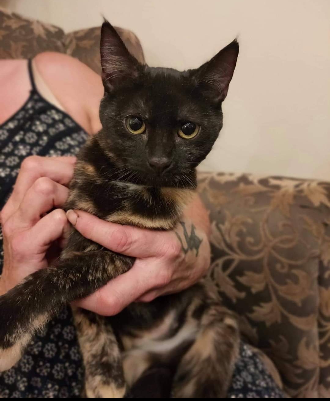 Beautiful tortishell Lizzie (roughly 4 months old) came into care at Whiskers and Tails Adoptions after being trapped at Elizabeth with her siblings when she was about 8 weeks old. Lizzie has been raised around other cats and a dog and is located in foster care at Gawler. She is a beautiful domesticated kitten now who is affectionate, very playful and litter trained. She is timid around new people so we are looking for a quiet home for her with no young children. She must be kept indoors for her own safety.