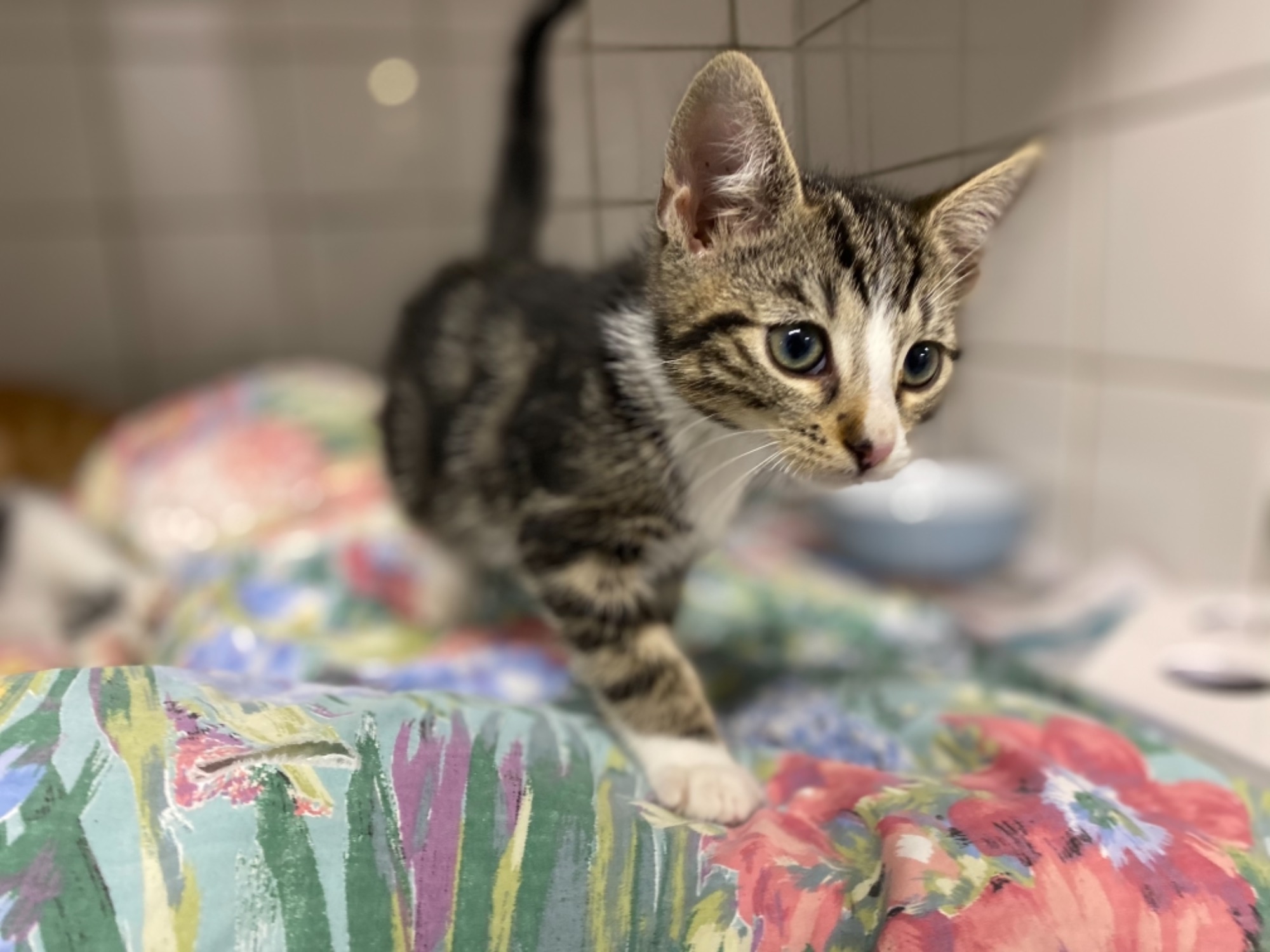 Sneezy is a 9 week old Male Tabby & White Domestic Short Hair Kitten.