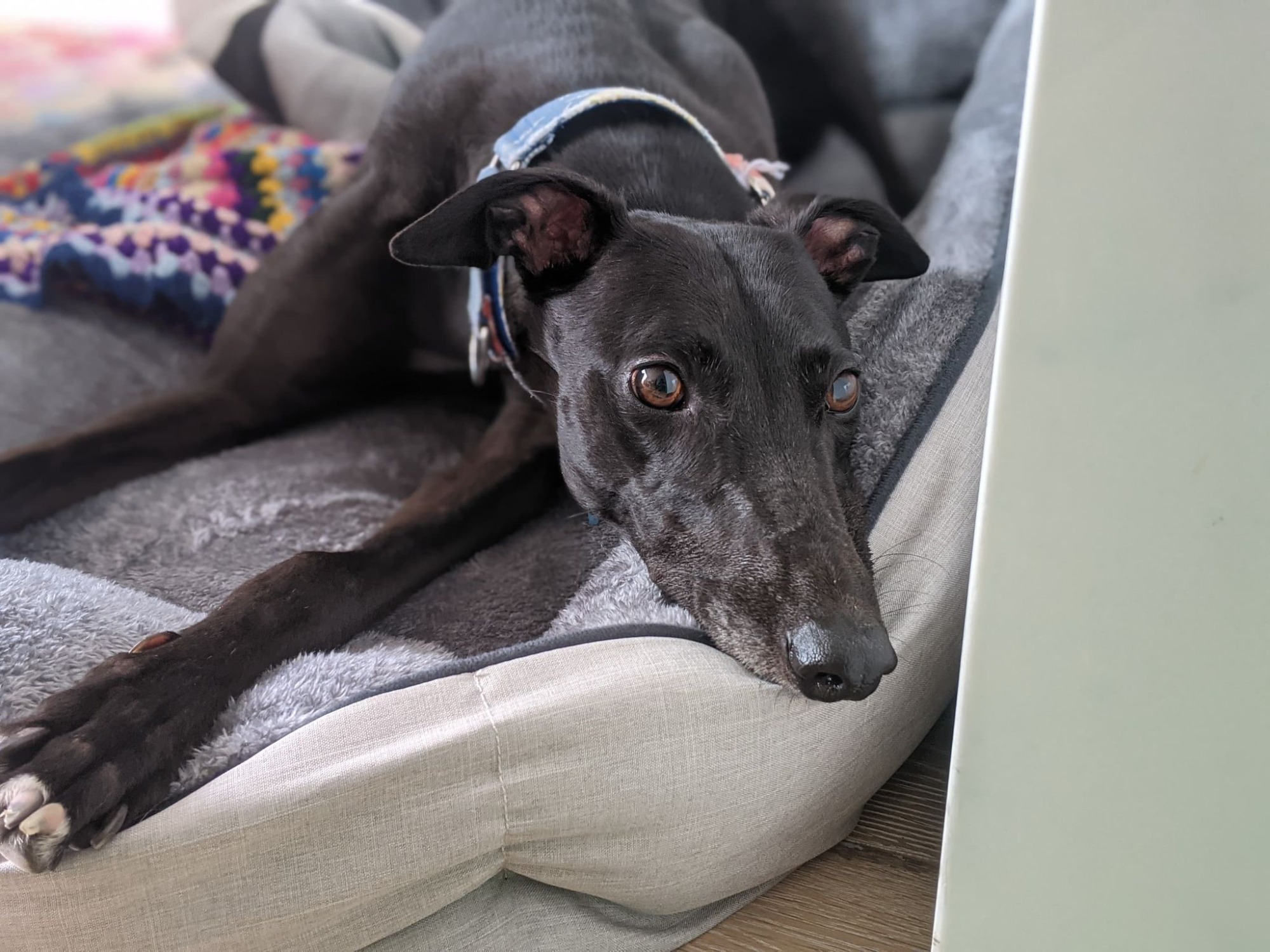 I’m super playful - I love playing with humans, my foster greyhound sister or even just myself! I love playing with toys, catching them, throwing them, playing bitey-face with them. If there’s no one or toys around in my vicinity, you’ll often find me rolling around playing with myself on the rug. For this reason, I don't need a big backyard as long as you have space for me to roll around inside.