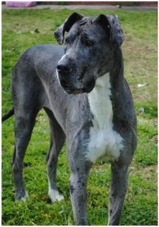 Tess is just a superb lady. She has been surrendered to us simply because her owners are unable to give her the time she deserves. Her colour is described as blue merle. Tess will drape herself around on your living room floor, give you lots of cuddles and generally just hang around looking amazing. She has a beautiful nature. Tess loves a walk but is quite strong on the lead, a gentle leader is good but she will still need someone experienced with handling giant dogs. She hasn’t had many walks lately so gets quite excited, but with more regular outings she will probably learn to walk more gently. She is not particularly good at recall (specially if she sees a rabbit) so her free runs would have to be limited to fenced areas and dog parks. Tess is good with cats, dogs and children