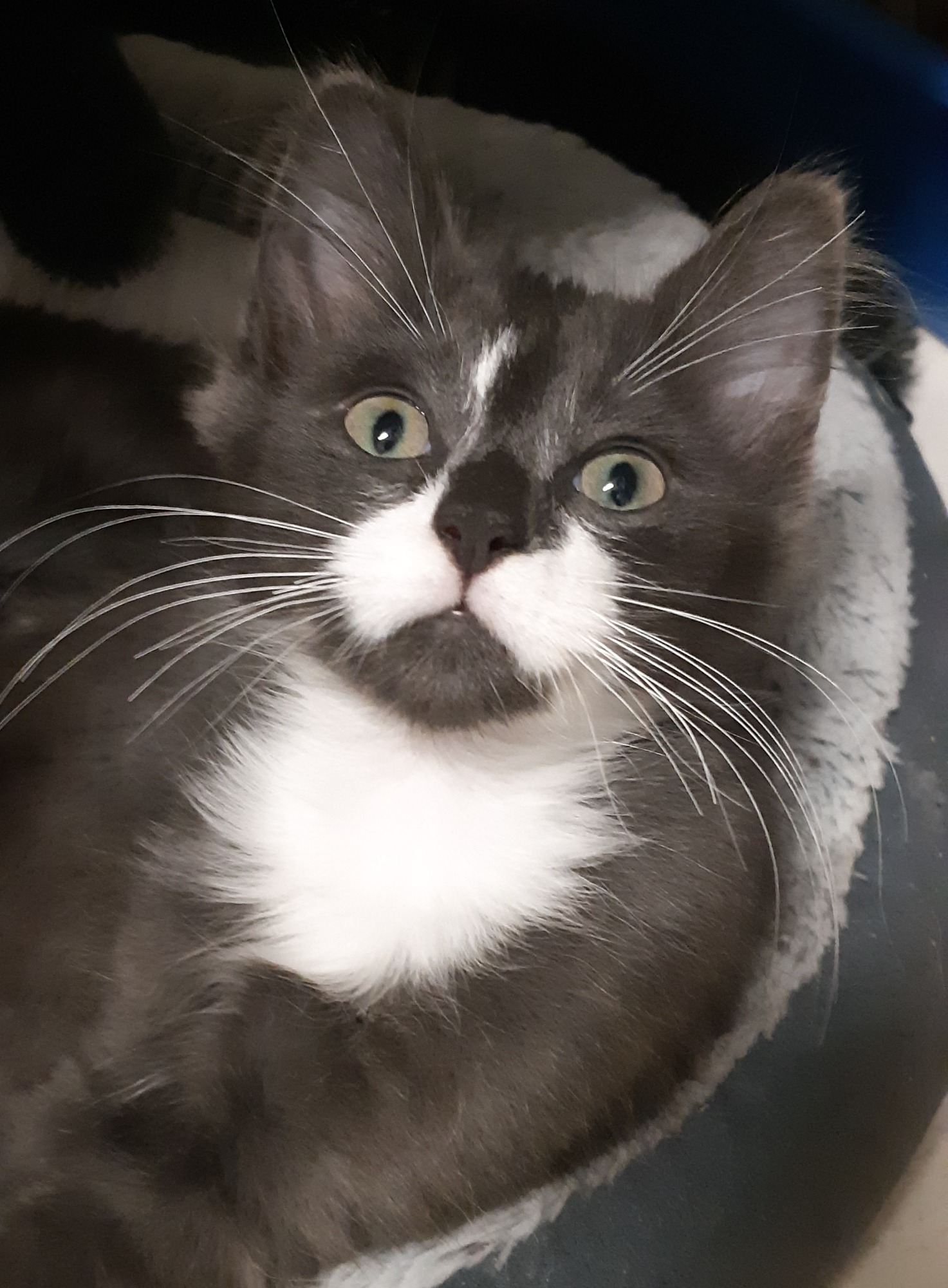 Jean is a gorgeous medium haired grey & white kitten. He is petite and adorable. When sleeping he loves to stretch out full length and show his tummy.