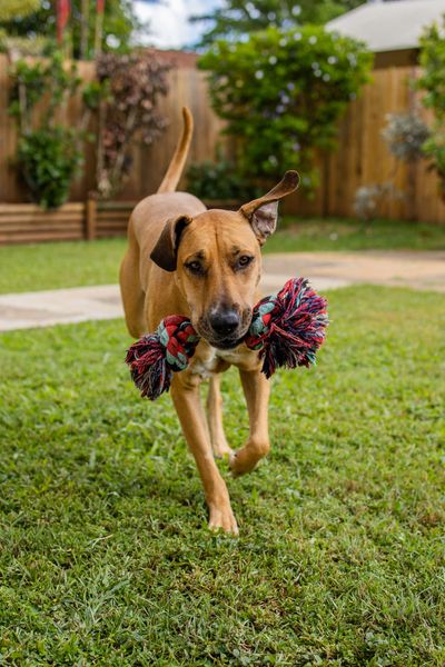 DJ is super social, loves company and hanging with her “pack”. She would do well in a household with regular interactions or company of another dog, as she prefers not to be alone for too long. Her favourite things are walks, car trips, fetch, tug-o-war and cuddles. She just wants to be a “good girl” responding better to praise and pats more so than treats. After being fed she’ll bring her toy over with a big bum wag as a thank you. She likes to sit near you or follow you around and can be a bit nosy, peaking in random windows if left outside. At times she can appear quite regal, sitting with her paws crossed and other times she is a big goofball resembling Scooby Doo (especially when she sticks her big tongue out). DJ knows how to sit, shake, drop, stay and play fetch properly, even sharing her toy to continue the game. She doesn't bark often, preferring to huff under her breath most of the time. She needs some training to walk well on a lead, however she is already walking well on a halter. She would make a great companion as she has a lot of love to give.
