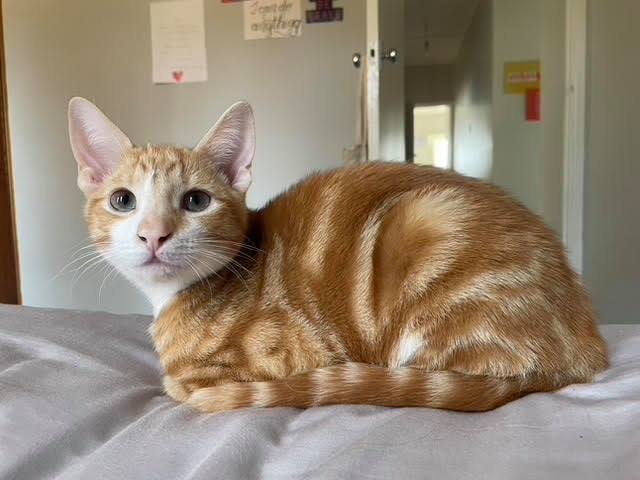 Marmalade is an active explorer cat that loves being occupied with checking out his world, whether it is the depth of his water bowl, hiding spots to attack from or what may or may not be hidden behind the curtain or under the sofa cushions. He’s smart and likes creative toys like puzzles and things that fly. He loves dry food and can open his jaw as wide as a snake to get as much kibble in at once as possible. His favourite resting position is the loaf, because it enables him to keep a close eyes on his surroundings. He doesn’t fancy being picked up, but loves back pets.