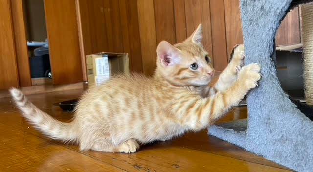 Olli is a wild, spicy ginger kitten that has recently mastered his crab walk. He is fierce and fiery and loves stalking and attacking, his favourite game is fighting with his brothers, so be prepared for hot play time sessions. As the warrior that he is, he needs plenty of scratching possibilities to keep his claws in shape. He likes sleeping cuddled up inside of blankets like in a soft cave but also generously takes your bed or any other elevated spot if available.