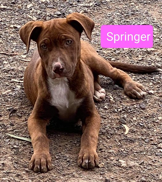 Springer is a typical playful pup and is good with other dogs. You almost forget she is only young due to her size. Springer has not been around cats, chickens or pocket pets.