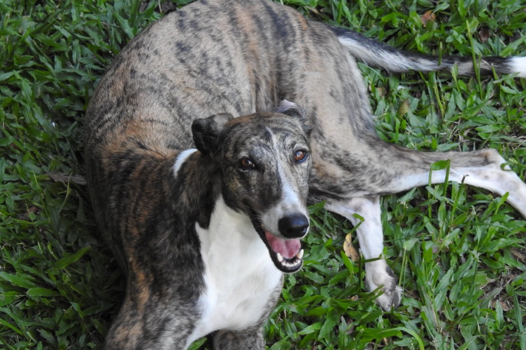 Hey, my name is Sammi. I am a beautifully marked brindle greyhound. I am a very friendly dog, looking for someone that I can hang out with when they are home from work. My foster mummy is so surprised by my calm nature and that I am quite happy to sit and watch the birds feeding in the backyard. If you are looking for an easy-going, down to earth girl, then come along and meet me! I am your girl!