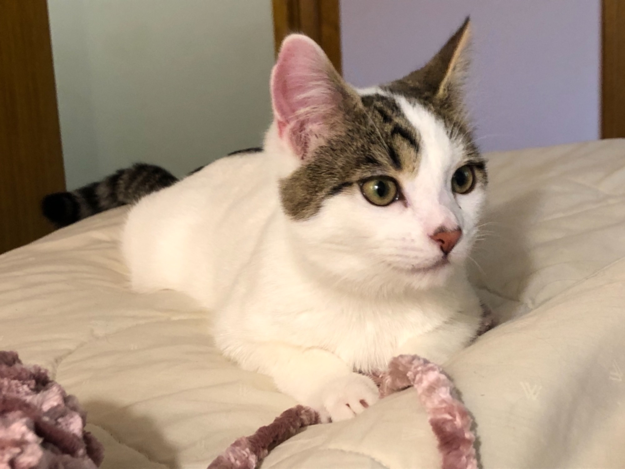 Such a sweet & gentle kitty, he can still be a tiny bit shy and scared of loud noises so will need a quiet home with a patient cat-loving person.
