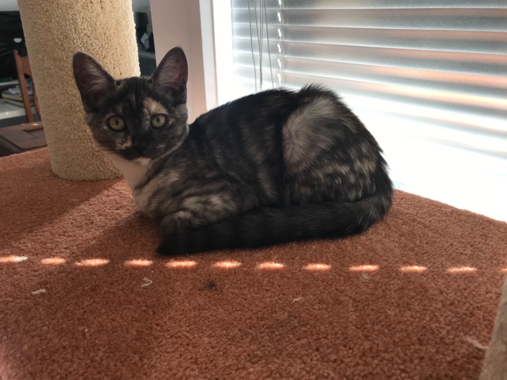 Lacey loves to sunbathe, pose for photos (her unique markings would make her a suitable instacat meowdel), sleep on their cat tower, play with dangly toys, her siblings and anything fluffy!