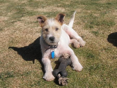 aero has been fostered with numerous dogs, small children and cats. He fits in well with all of them. Aero is learning to sit for his dinner, can play fetch ( sometimes he even returns the toy :) and is easily trained. He picks up basic commands very quickly. Aero is very placid and happy to just "hang out" inside after a play. Aero looks to be a wire haired jack russell crossed with someone taller. He is quite leggy and will possibly grow to a medium sized dog. Aero will suit any family situation where he is given lots of love and preference will be given to those who would like to take him to puppy training to keep up his socialisation. If you would like to meet aero please give us a call