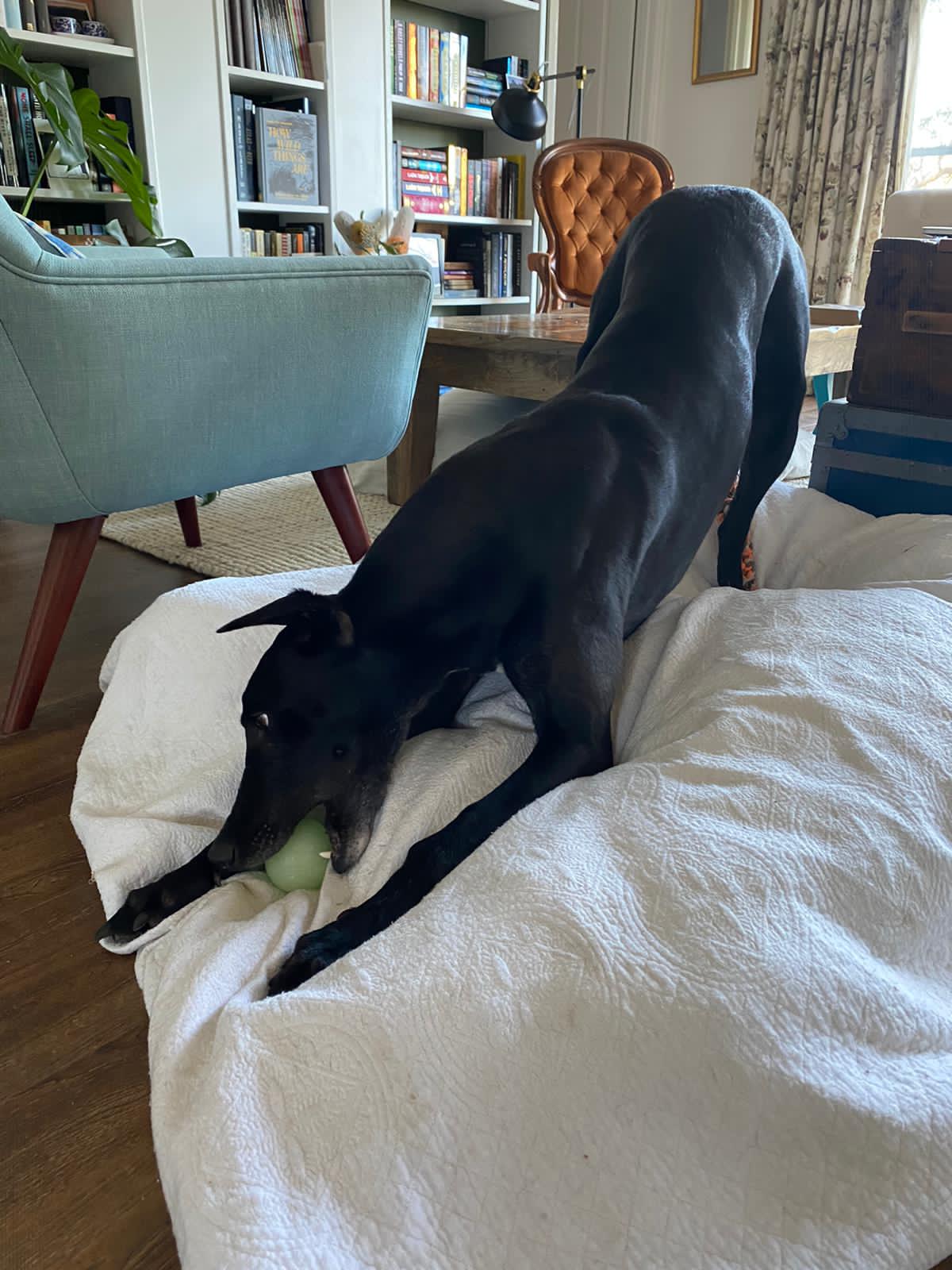 Gary is the best room mate with his greyhound foster brother. Up for a play but quite respectful of downtime of his foster mate's occassional grumpiness. He is still getting used to meeting other dogs on his walks, sometimes getting a bit excited and enthusiastic. He doesn't like off lead dogs buzzing around him when he is on lead but gets along well with medium and larger dogs on his playdates.