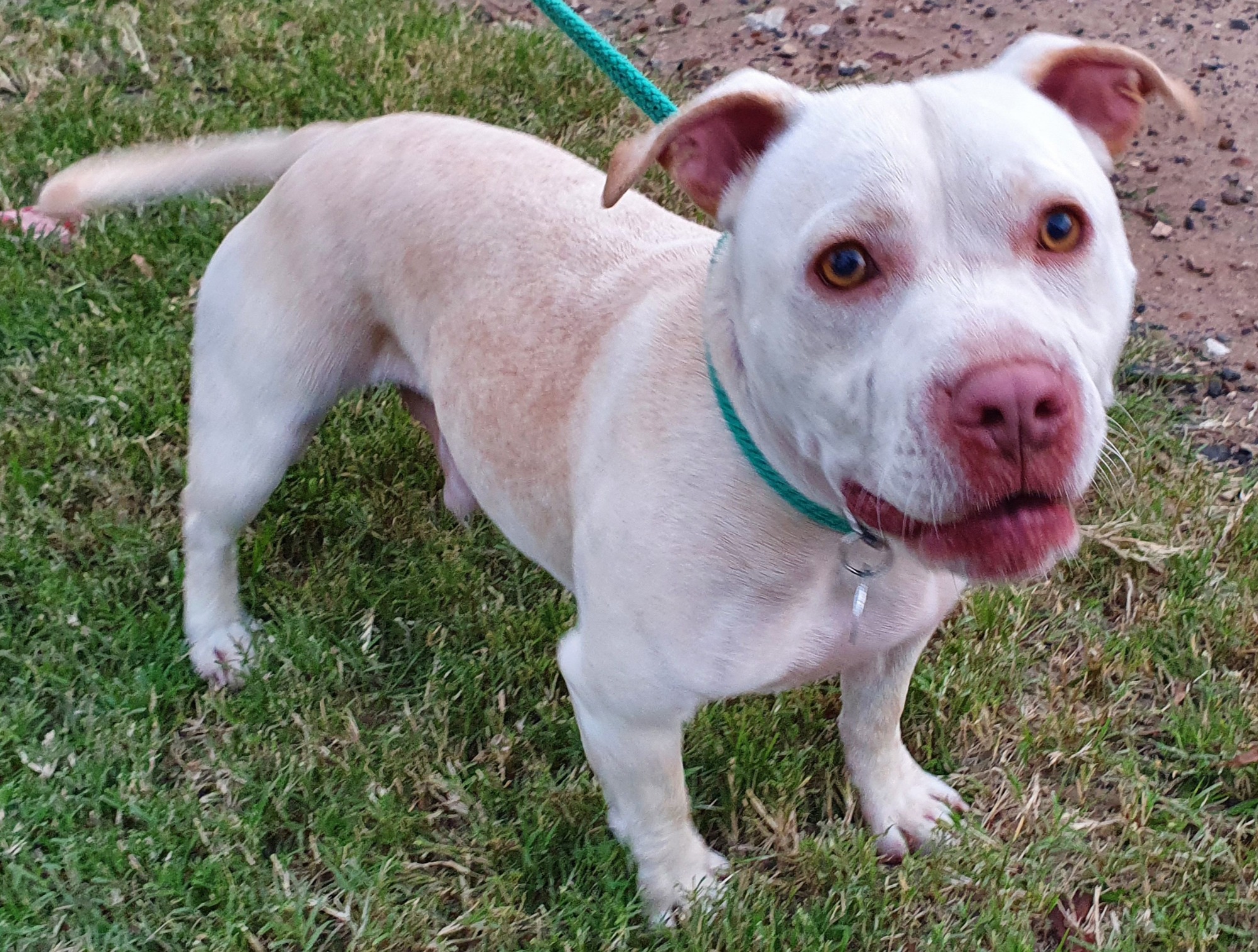 Yhandi weighs 14kg and his breed mix identified through DNA of a litter mate is Staffordshire Bull Terrier, Maltese, American Staffy, Rottwieler and unspecified breed.