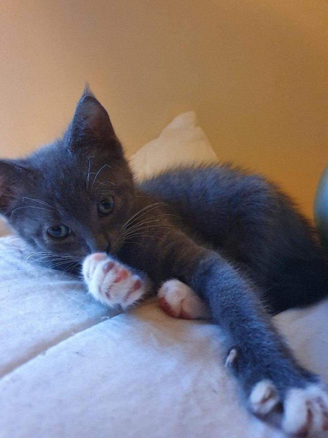 Theo or Theodore (grey) is the sweetest, most gentle boy. He does his own thing. Sometimes with the siblings but often can be found asleep on the window sill by himself. Loves dry food (weird, but you do you Theo). He's so gentle. Never claws you up the leg. Uses his paws like hands to reach out and touch your face to engage. Loves looking in your eyes to see what you're thinking. A thicker fur than his siblings. 10/10 great cat.