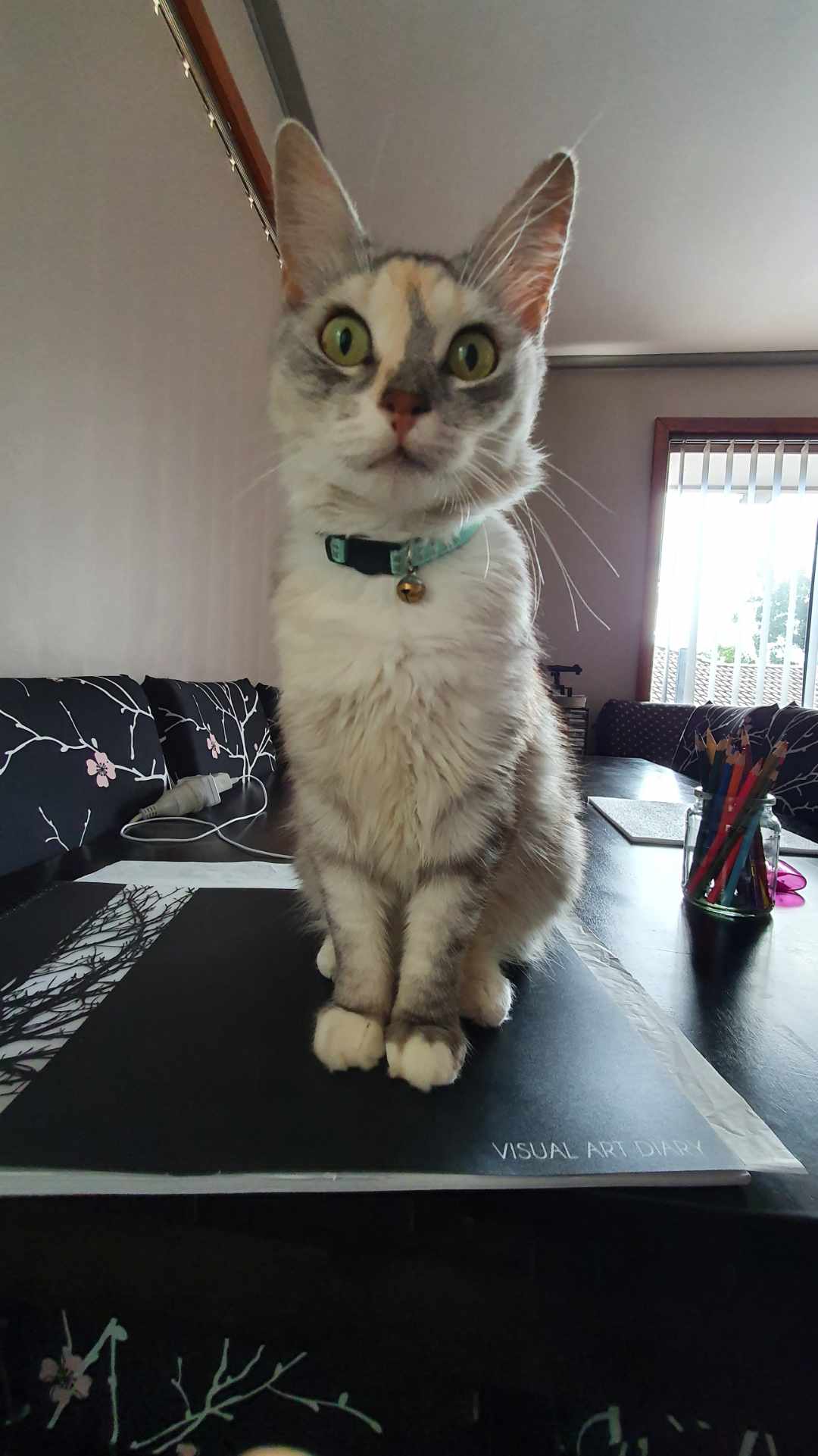 She is super friendly and loves everyone she meets. She is a bit of a snuggle cat, and follow her hoomans for snuggles whenever she can.