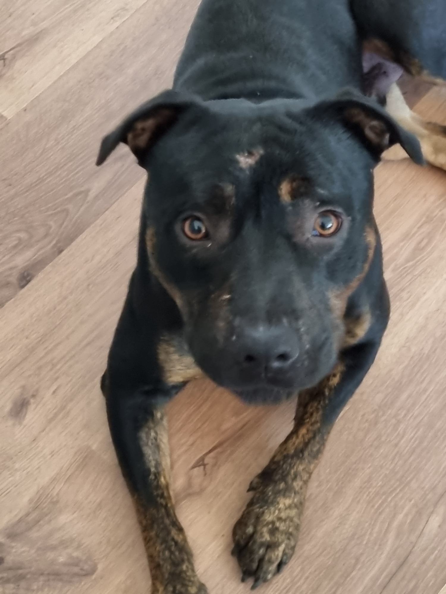 He is staffy mix 18mths , and his owner had to move and couldn't take him.