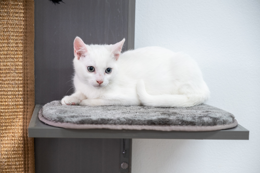 Miney is a very sleek, all-white little guy, ready to play his way into your heart. Miney is very playful and inquisitive and has endless amounts of energy. He loves his food and his toys, and this will be the way to win over this sweetie. Miney is very inquisitive, checking everything out in order to work out the world. He also loves to climb, so you won't be able to hide human food away from him on high surfaces. Miney is quite the little chatterbox and very quick to reward your attention with a purr. Unlike most cats, Miney loves a good old belly scratch and will also sneak up beside you on the couch for some snuggles and to share your warmth. He is just a very sweet natured little boy who will be wonderful company for his forever family. Miney has not been the biggest fan of dogs in his foster home, however, he is learning to be more comfortable with them over time.