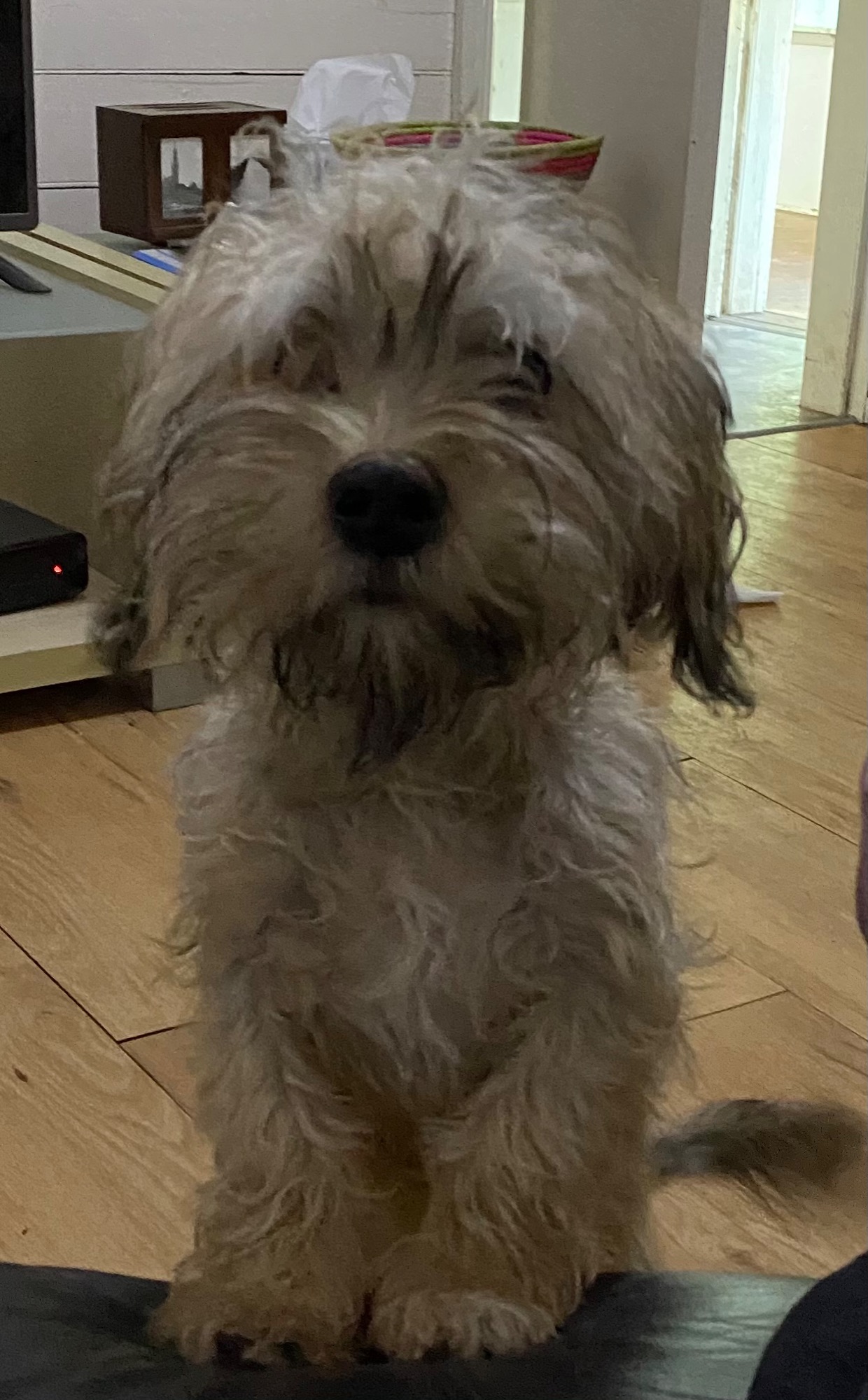Tip has the softest curly coat, which had been cut with scissors by his previous owners. I have just clipped and tidied up his face.