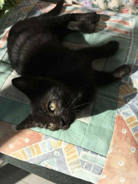 She is an inquisitive, cheeky little girl who holds her own in the sibling rumbles on the floor. Almost completely black, Fe has a little white patch on her chest with gold eyes (at the moment).