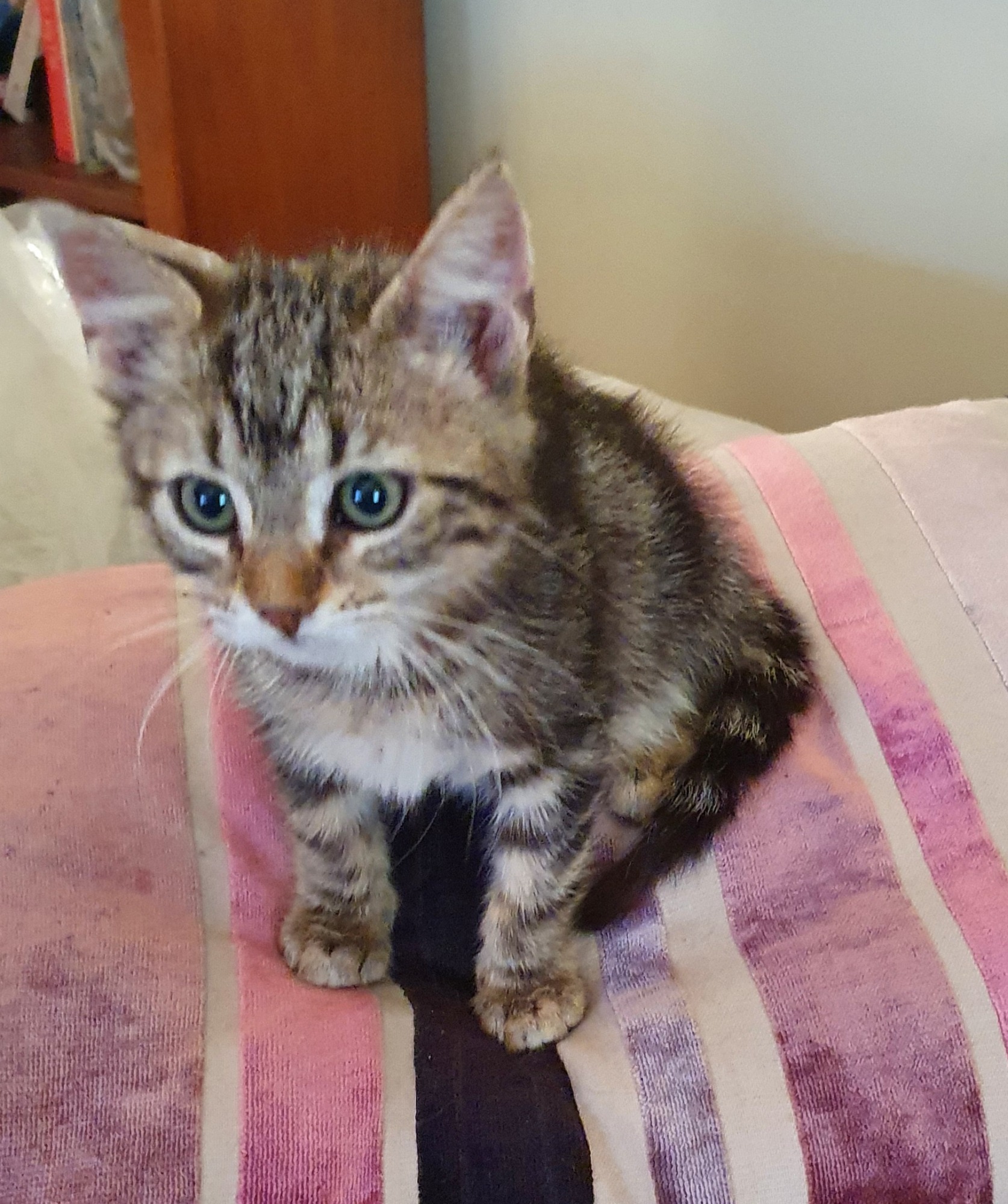 Teddy was rescued along with his siblings and went from scaredy kitten street waif to tiny teddy tabby gorgeous boy. He is incredibly smoochy and purrs when just look at him. Loves getting patted and cuddled. Of course being a kitten playing is a fave activity and he is always up for a play with his toys or fellow foster kids.