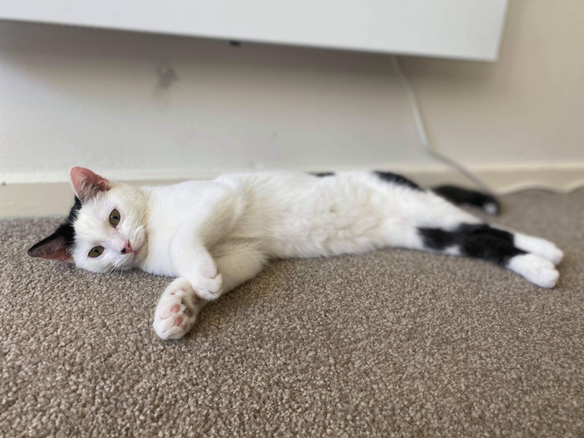 His hobbies include; eating, jumping in and out of cardboard boxes and communicating his kitty thoughts through adorable chirps and meows. Milo has beautiful unique black and white markings, including an all black tail with a small white tip and an adorable ‘beauty spot’ on the end of his nose.