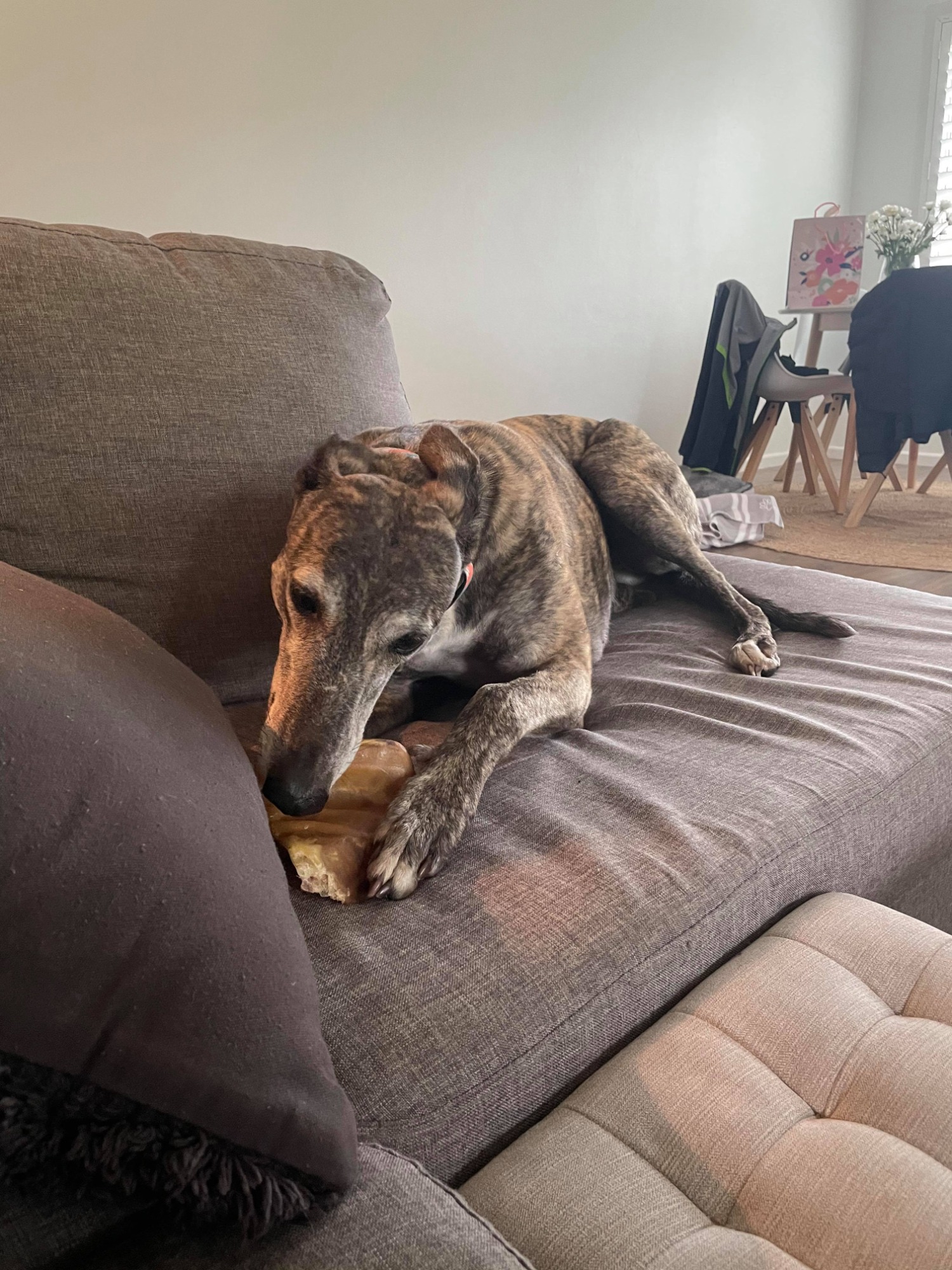 She is currently living it up in foster care with her foster greyhound brother Riley! They not only get on splendidly, but you can catch them cuddling on the bed, too! So we feel that Roxy would really love a buddy. She hasn't been around other breeds yet though.
