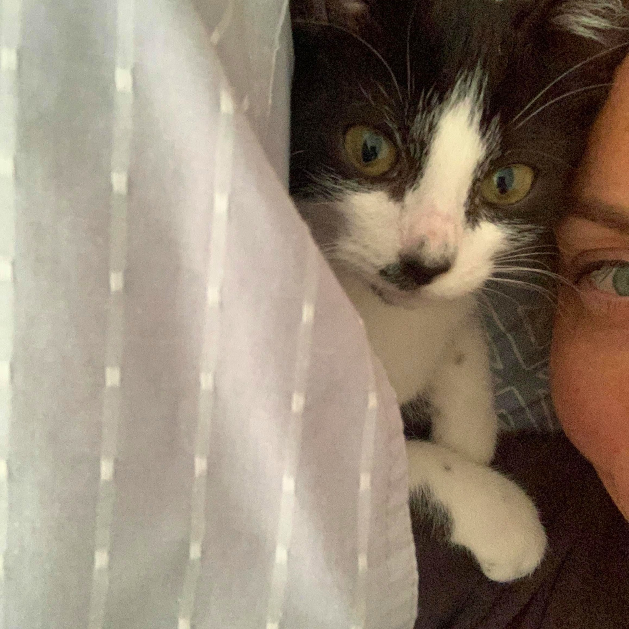 Brad Mitt is a very handsome boy with tattoos... ok cute 'black dots' on his arms. He just loves snuggling very close to you in bed and give you loving licks.