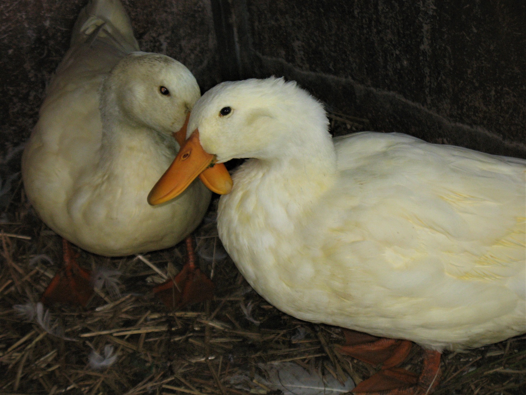 These two Pekin Ducks are good friends and have always been together. They are about 15 months old. They are not hand tame but are used to being close to humans. They could be tamed further. They have the beautiful lemon coloured bloom showing through from their under feathers.
