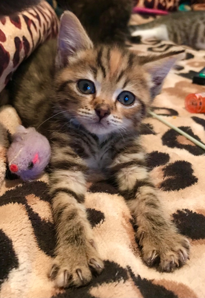 Rebekah is a super stunning tabby girl. She is a super sweet, affectionate little kitten. She loves pats & cuddles & will happily sleep under the covers with you at night. She has grown up with a variety of other foster cats & kittens & 3 crazy Bengals so will be keen to make friends with any cats you already have!