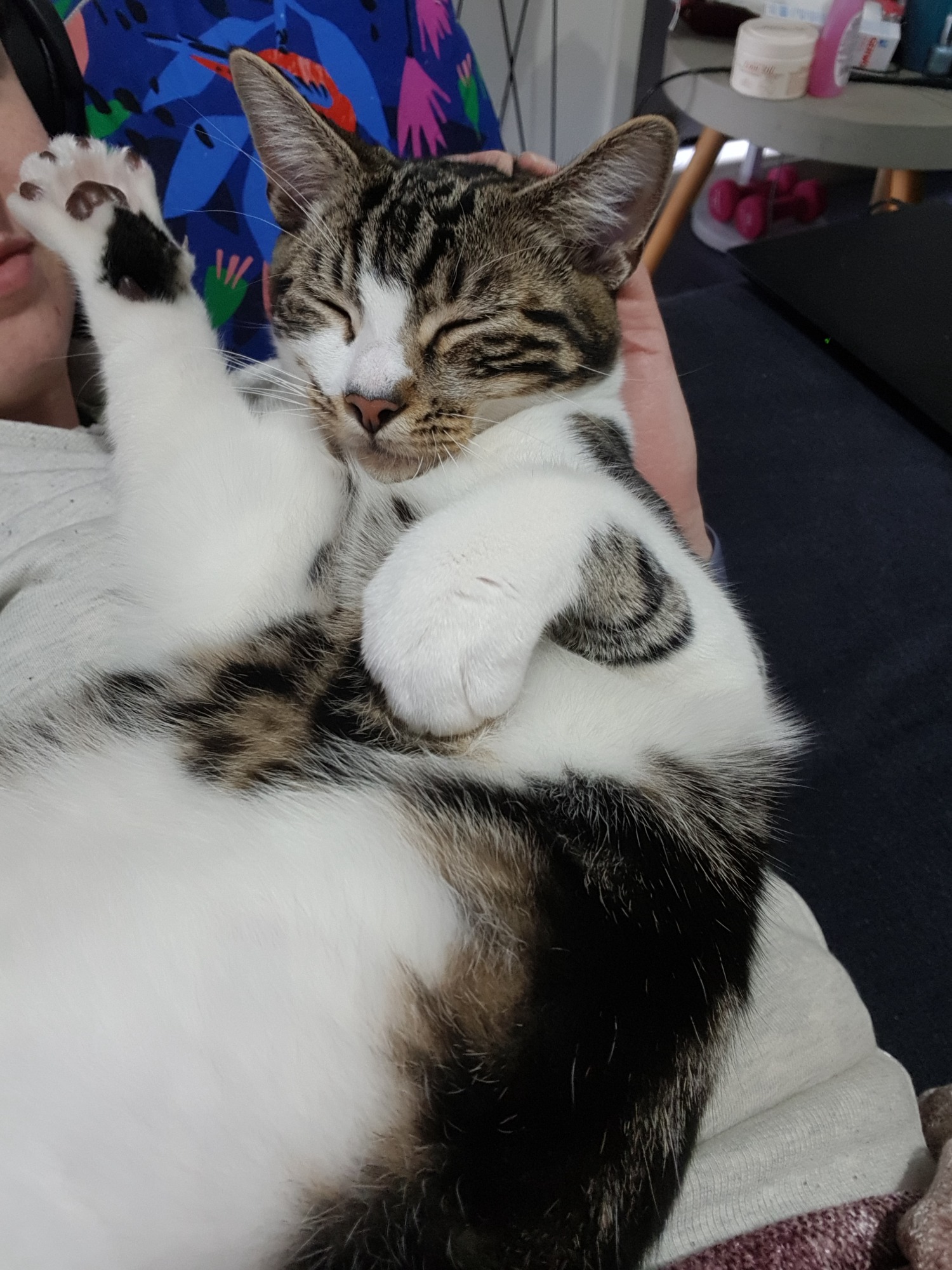 Felix is a confident kitten who loves both playtime and cuddles. He spends half his time being the sweetest cat in the world, snuggling up to you and showering you in headbutts and purrs. However, he spends the other half of the time running non-stop from one end of the house to the other, jumping on everything he can, and playing with anything he deems a toy.