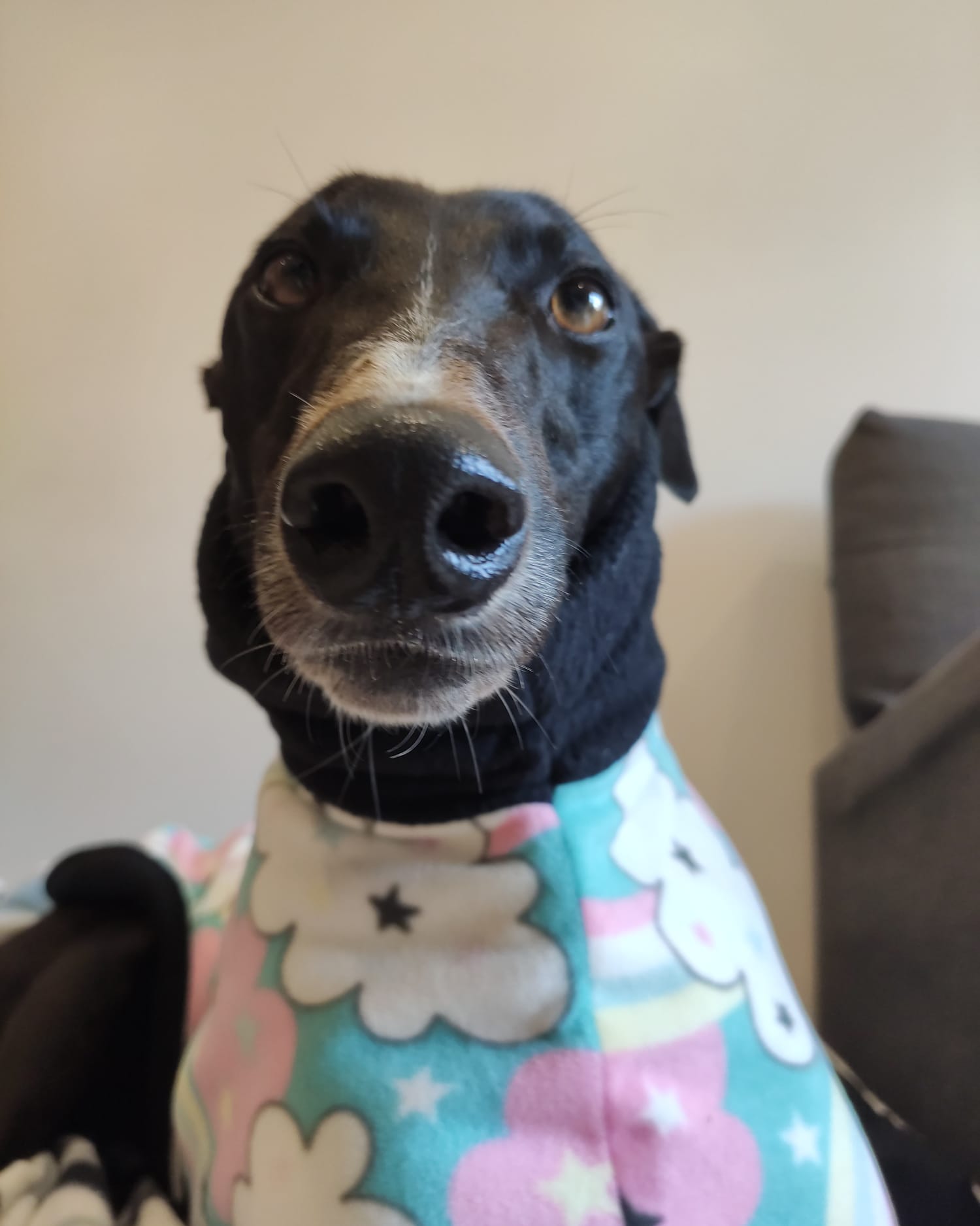 At home in her foster home Luna is a great companion for her foster sister, a young whippet but is OK with her own company too. If the puppy gets too much she is happy to find her own quiet space. At home you can go about your chores without much fuss - sure do the vacuuming around me, just dont expect me to move from the couch.
