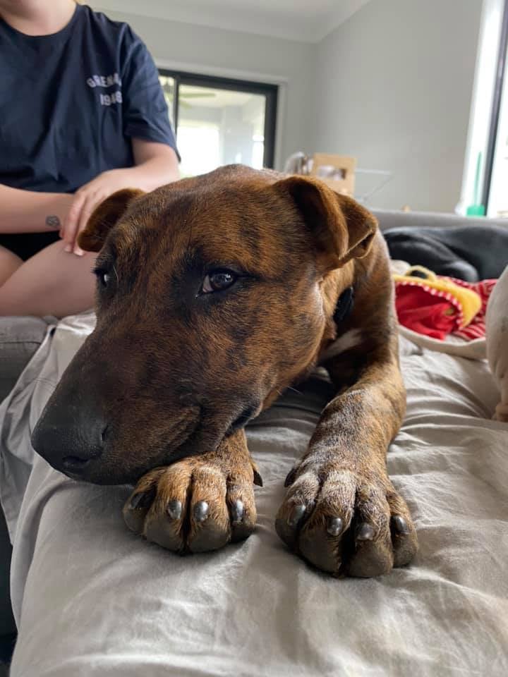 Diego also likes to snuggle, and is very happy to cuddle up next to you on the couch or at the end of the bed if you’ll let him. He always has a beautiful staffy smile on his face and often you can see him bouncing around in his dreams.