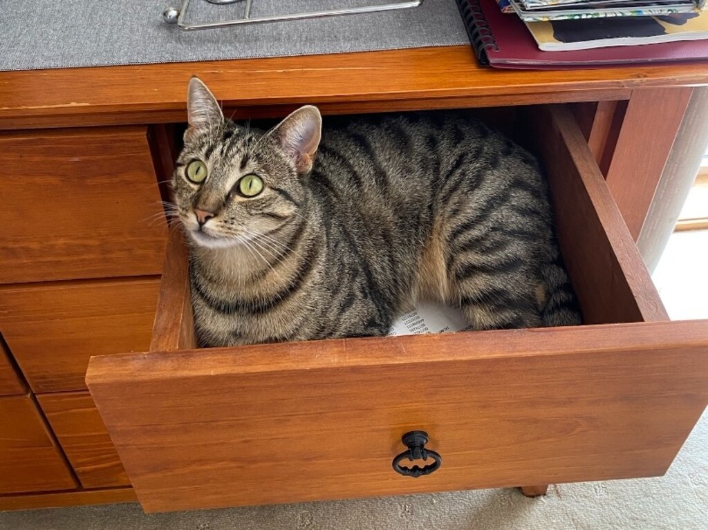 MOLLY #302C is the best that a female tabby can be: intelligent, loyal, confident, playful and funny. She would make a great pet for a family as well as for a single person at home who would enjoy the company. She came from small acreage where she was free to roam during the day but was always inside at night. Her previous owner has relocated to Queensland and was worried that Molly would not adjust to being indoors for a couple of months and then not having acres to roam around on, so sadly she has been surrendered. However her carer has found her to be most adaptable as she has settled very well in a cattery setting and even spends her time free in the cattery space mixing well with all of the other cats. Having said that she can be a little bossy to some of the more timid cats but is not aggressive and generally fits in very well. Molly tries so hard to get her carer's attention by seriously smooching around her carer and generally trying to be the clever centre of attention, so if you think you could give Molly the home she needs give us a call. Molly is 2.5 years old