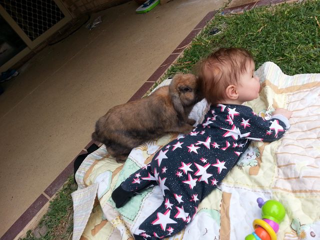 Flopsy has a maternal instinct and a soft spot for babies - she can't resist coming over for a look when there is a baby on a mat. She is very gentle and a little timid but curious and will become more amenable to pats as she develops trust.