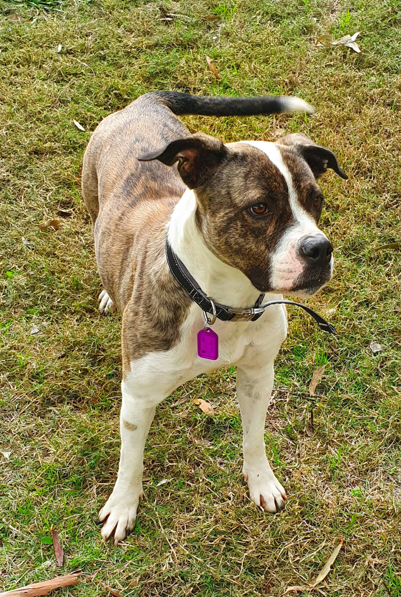 Sally is beautifully behaved in the home. She walks well on lead, is very easy to train with treats, and knows all her basic manners – sit, down, stay, come, wait, leave it. She’s also learning to go toilet on cue, but also asks politely if she does need to go out by sitting at the door. She knows what’s hers to chew, where she’s allowed to go (even if that means laying right in the kitchen doorway so she can watch you cook), and doesn’t bark... but like most staffies, she likes to chat.
