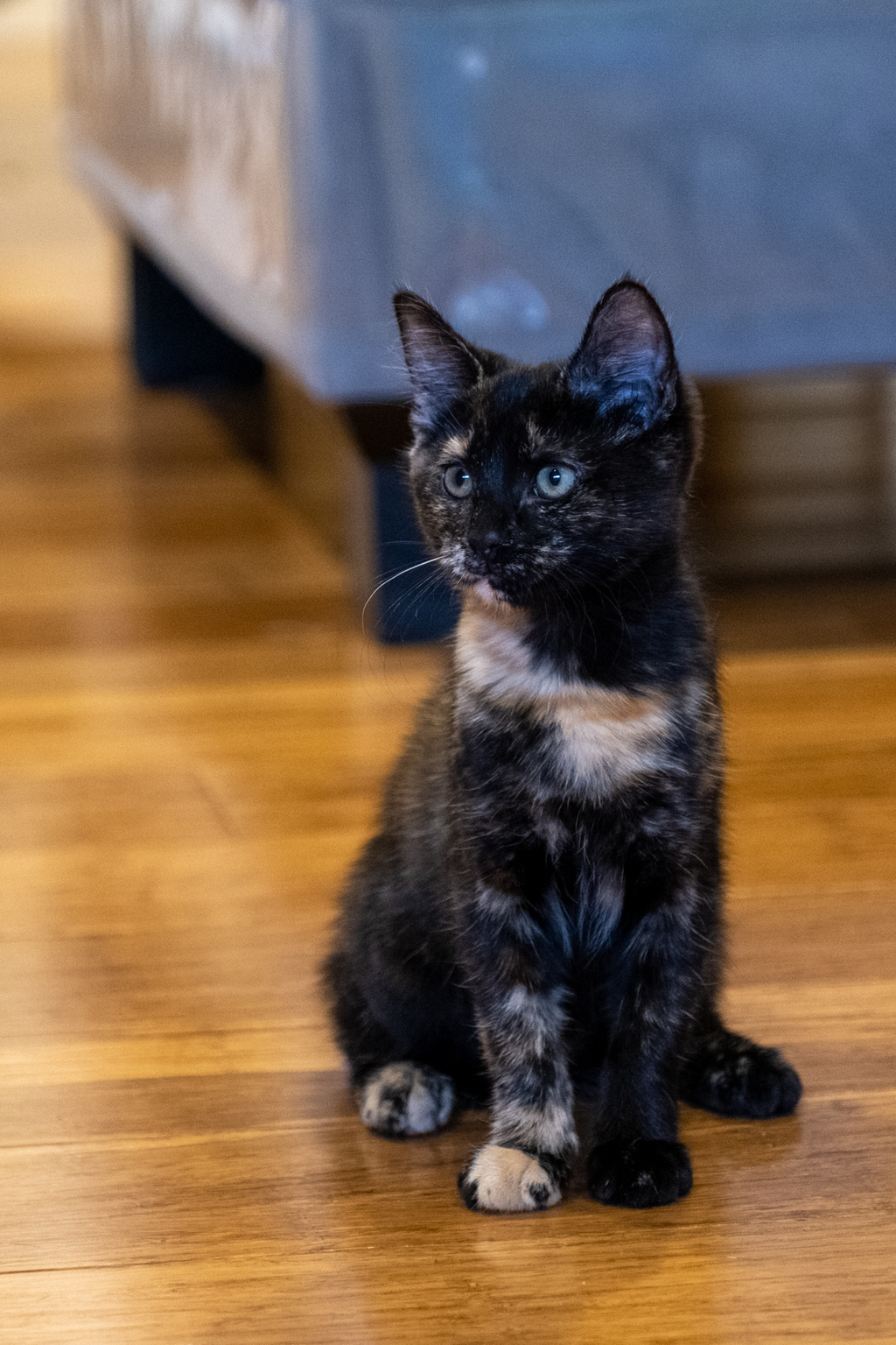 Thelma is an energetic love bug who enjoys a good zoom around the house when playing. Her favourite toy is the robot vacuum cleaner, but beware, you may not be able to do much vacuuming when she pulls off the brush to run around with it in her mouth. Thelma loves playing with her sister and the resident cats, and can often be found cuddling up with her sister on the cat tree or snuggling up on the couch with the cats. When she isn't snoozing and snuggling on the cat tree, she loves to climb and adventure up high. She is a chatty little girl who loves to talk, calling out when she can't find her sister. She can be heard singing when she plays, letting you know she is having a lot of fun and likes to sing and chirp as she is eating, telling you how delicious her food is. Even as she's snoozing, a pat will elicit a gentle meow letting you know she loves you. Thelma is very good at head butts and will head butt your arm or hand gently as you pet her. When it's time to sleep she loves to sleep on your lap and feet and cuddle right up next to you.