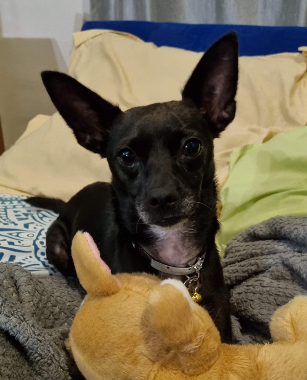 Mia would love another fun loving little dog her same size to playhouse and share her fascination with stuffed toys.