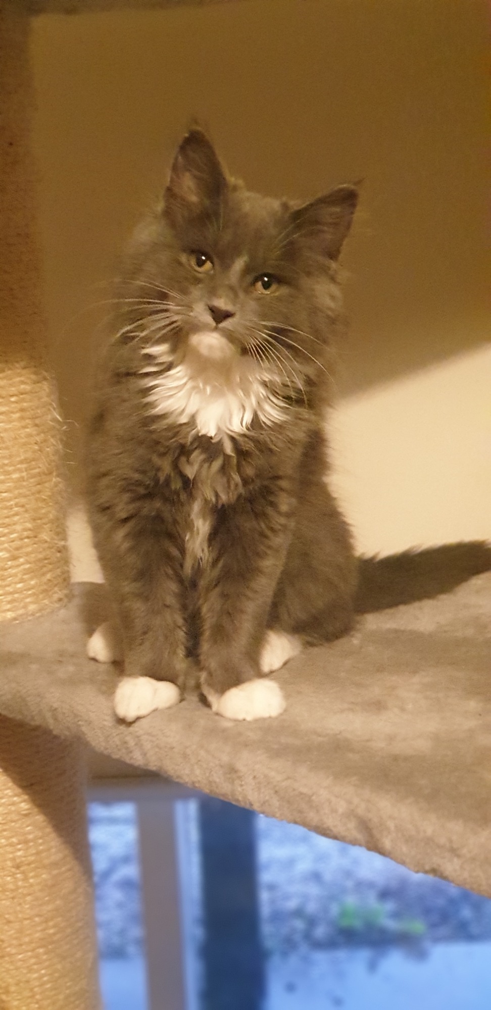 Molly is a long furred puss so would benefit from being brushed regularly to help her look after her stunning coat. She will happily laze in a window bed soaking up what little sun we are getting at the moment or come and bat your fingers as you type on your phone while purring away on your lap. She is ok to spend the day alone while you are at work as long as she has something to play with while your gone.