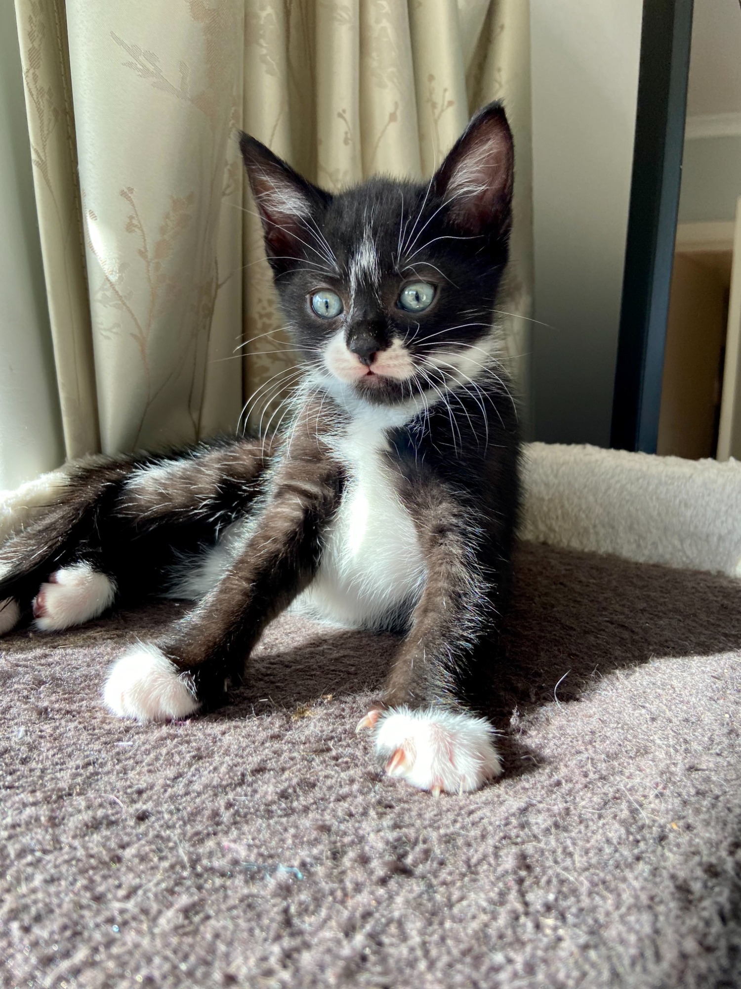 Blaze is a smoochy affectionate boy, who just loves to be loved. Other than wrestling his siblings, his favourite activity is to snuggle up with his foster parents in bed. He's very cheeky and strong willed, and has a voice on him to tell you off, or demand attention. Blaze doesn't like to be picked up, but he absolutely can't resist snuggling into a lap, or smothering a chest with his engine running wild while baking biscuits. He will often wake up through his naps to just make sure we are still there and chirp to us about his dreams. Blaze can be quite shy and skittish when meeting new people, but when settled he is a complete shadow and will be hot on your heels always.