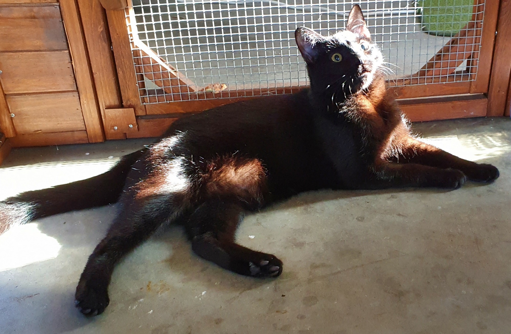 Haige is chocolate coloured in the sun but a black cat when you generally look at him. He gives the most amazing nose kisses and smooches. Haige is such a sweet cat. Haige is great with other cats and has been around dogs.
