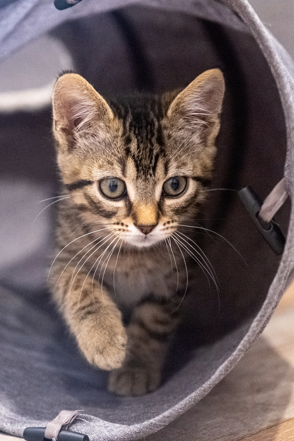 Freddo is a very playful and cheeky kitten as well as being very smart and inquisitive. However, most of the time he seems to think he is a parrot. He loves sitting on human shoulders and will balance there until he falls asleep, and if he is not on your shoulder... he will be in your hoodie! Freddo loves being carried around and just staying snuggled his foster humans' arms as they walk around the house. Handsome little Freddo is also super affectionate. He will purr as soon as you look at him and if you pick him up and have a chat with him, he will most likely give you nose, and even eye, kisses! When Freddo is having a play session he also tends to chat away to you while you play with him. Freddo has become quite comfortable with the resident dog but required a bit of a slow and gentle introduction and prefers the dog to be fairly calm. He is good with kids approx. 6 years +.