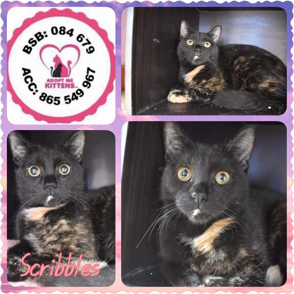 Scribbles is such a sweet little lady. She is a little timid at first but when comfortable becomes a smoochy girl. She loves being petted and enjoys sitting in the arms being cuddled. After introductions she gets along with other cats. The big dogs can be a little scary but she doesn't mind them as long as they don't get too close. She will stand her ground.