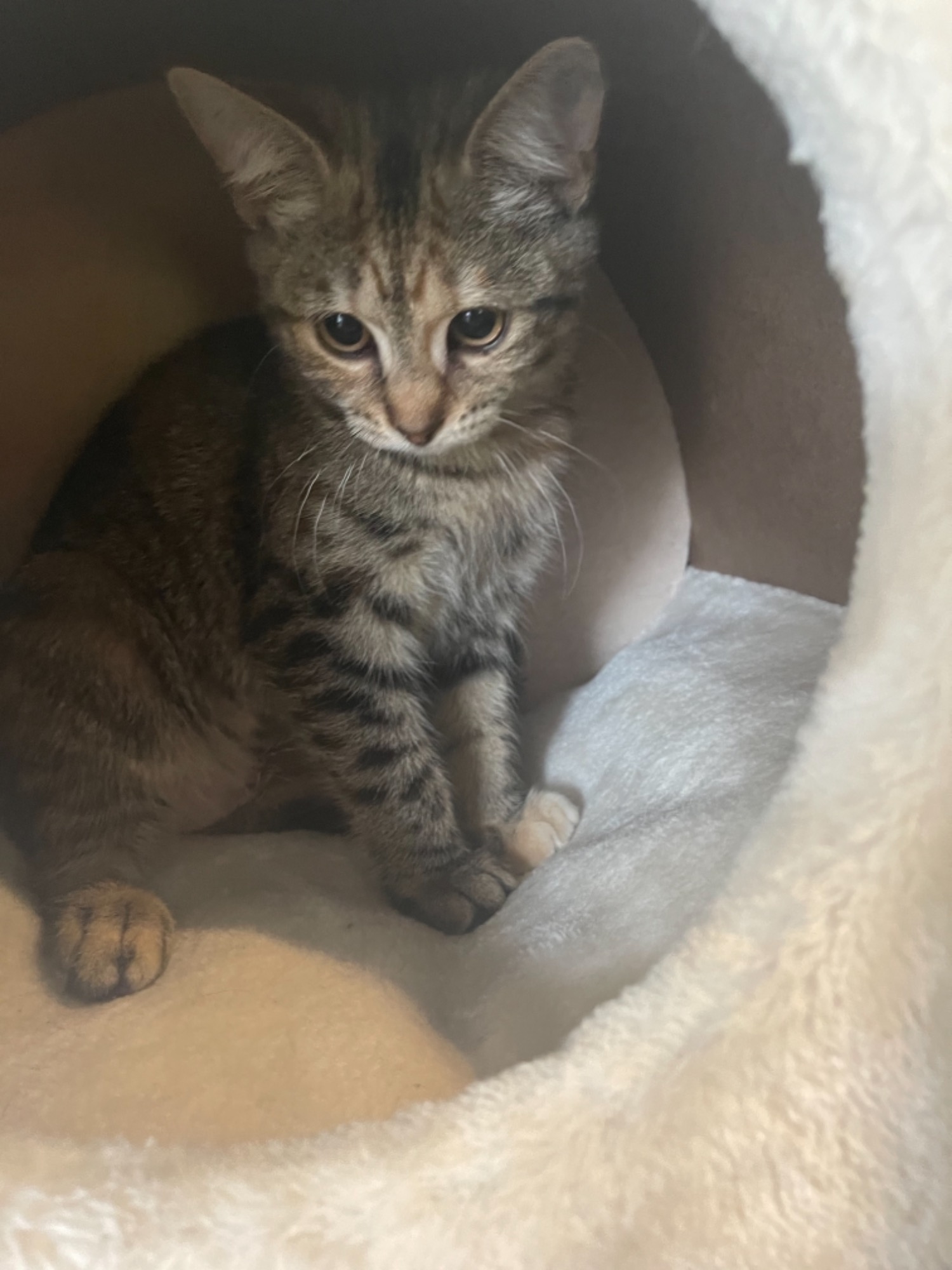 Hazel came into foster care with her mum and 3 sisters. She was at a high kill pound and rescued by meow rescue. From day one at her foster carers home Hazel has showed she is a very special little girl. Hazel is the sweetest cuddle bug of her litter. She will not disappoint with the amount of affection you will receive with her by your side. Hazel loves her food and will let you know when its dinner time with a meow.after a play she loves to laze on her bed and nap. She will be a much loved addition to your home with her cuddly, friendly and social nature. She is a confident kitten who loves to play with you and her cat toys. She will keep you in fits of laughter with the way she loves to perch up high on your shoulder and give you an affectionate kiss. Whether its playing with your or receiving tummy rubs, she will purr from just being in your company. Hazel would love to go to her forever home with another feline friend to play away the day with. However she would also suit as an only cat home where you will be home and shower her with love and affection. She is child and dog friendly and raised in a foster home with small children, adult cats and large dog. She would be happy in a home with all of the above.