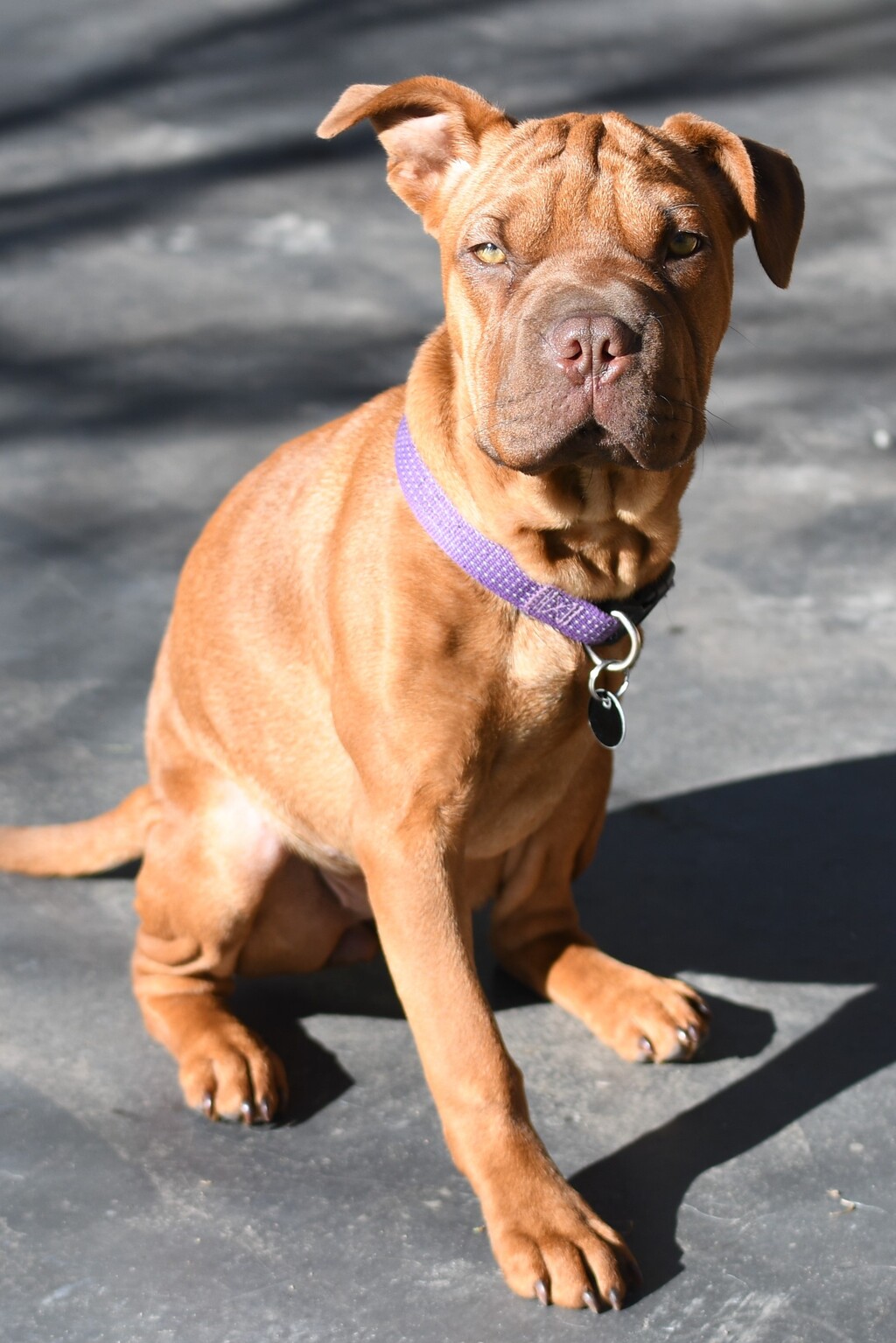 PENNY #2742 is a lovely natured sharpei/staffy cross pup who is coming up to five months old (D.O.B. 16/2/21). She is a very special girl who had to have her front left leg amputated after she was hit by a car. Even though she has had a rough start her carer has found her to be the most wonderful, laid back, easy girl. Penny manages her disability well but her new owner will have to be aware of her special needs and she will require a level yard and easy access to her home (no stairs). Her exercise requirements will need to be tailored to suit her disability too. She enjoys the company of other dogs, big and small, and is used to a home with cats. She will only grow to a medium size (maybe 20kg?). Penny is desexed, chipped, vaccinated, worm/flea treated and vet checked.
