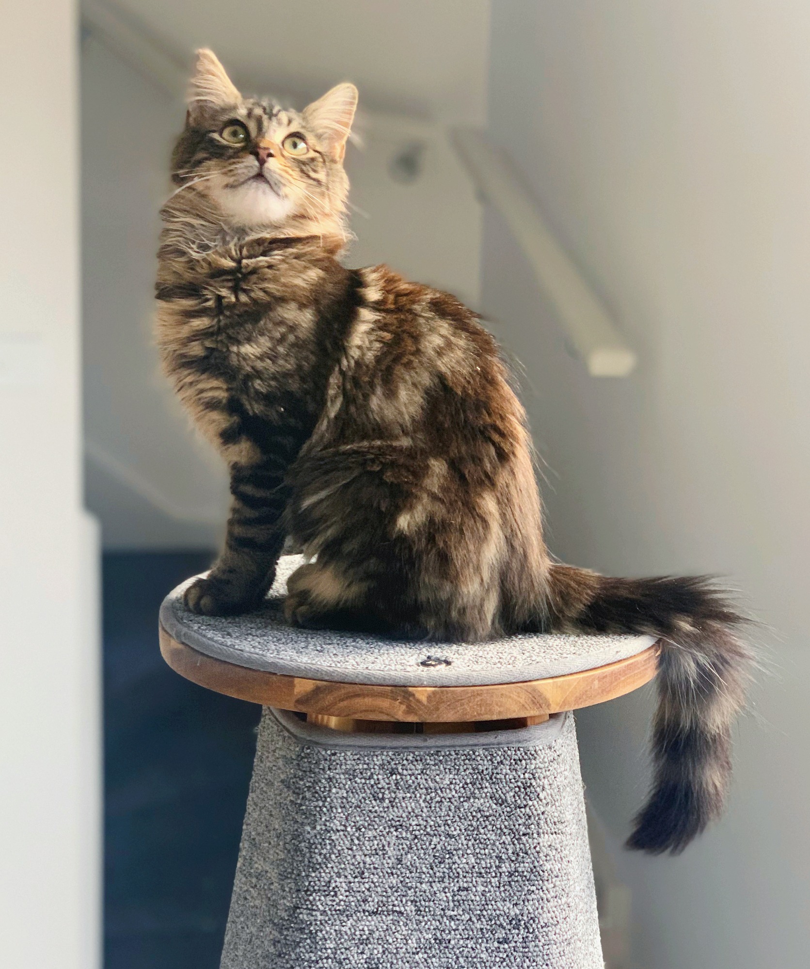 She’s an independent girl who loves doing her own thing whether that’s playing with toys, climbing up the cat towers, window gazing, sniffing the indoor plants or flat out chasing her tail. She’s very energetic and loves giving all her foster siblings the challenge to race her up the stairs.