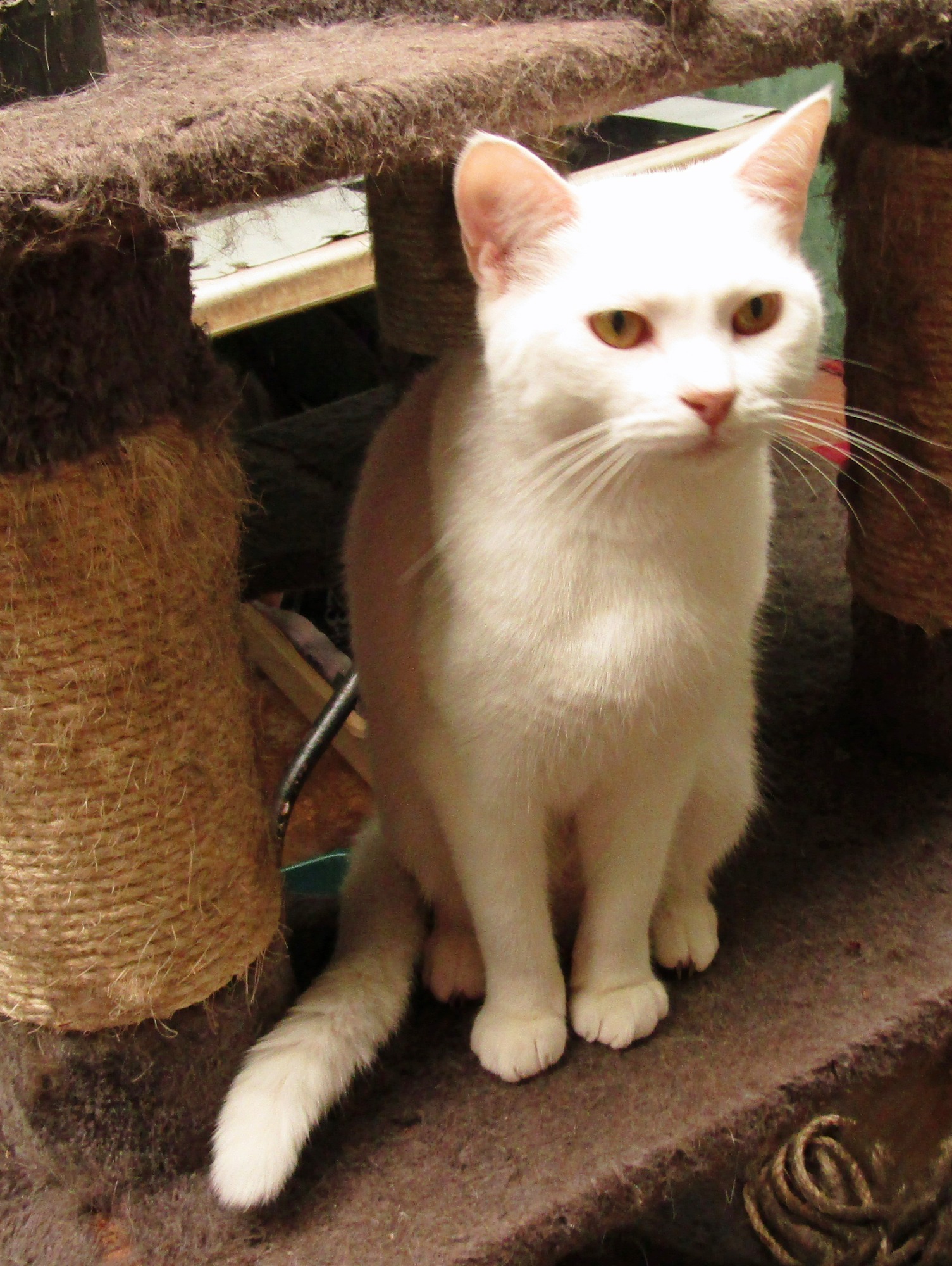 Snowy was surrendered due to her owner not being able to afford to keep her, she is a lovely affectionate indoor cat. She will follow you round, tolerates being picked up for short periods, prefers not to be carried in your arms any distance, happy to sniff you and head butt you. Just a gorgeous girl ready to go to her new home.
