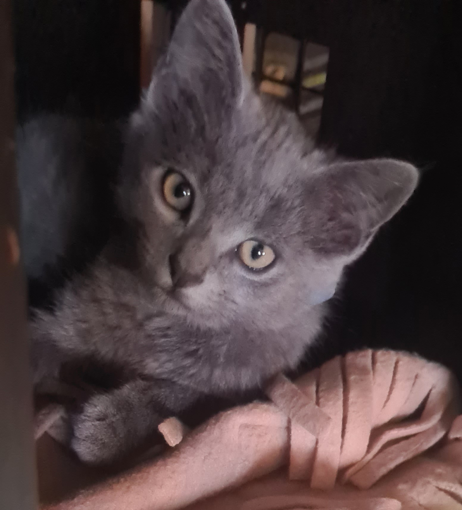 Raynor and Raylyn came in with their semi-feral mother Raven. They had been found at the bottom of someone's garden. They had been feeding her through the pregnancy and since having the babies. The landlord had found out so asked them to get rid of them as they were not allowed pets. They were bought to happy paws, Raven is in foster care and we are hoping she will get used to being with humans. Her two babies are getting use to us now, they don't mind being touched and stroked, they are fine with cuddles too! They are in the kitten room now learning to play with the other kittens. They have been desexed, immunised and microchipped.
