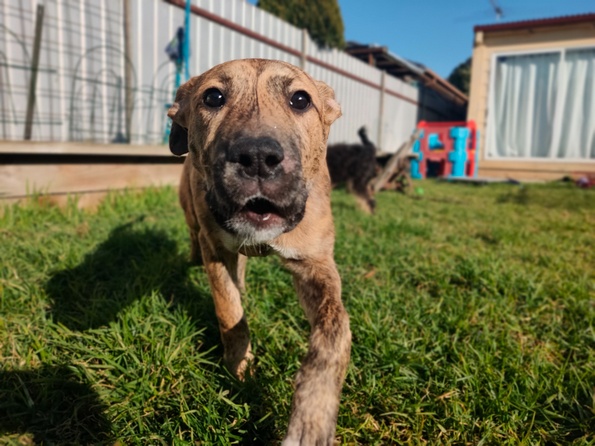 Hi meet Freddie he's a wolfhound mix he's about 5 months old. And quite the chatterbox. He loves to talk to you. Great with other dogs. Hasn't met a cat yet. Typical puppy needs training and wants to learn. Would benefit from weekly dog training he likes all dogs. He's a little Nervous for a few minutes but settles quickly. Loves pats. He might be a large dog so if you want a small dog please don't apply. I came in with my sister and really playful with her.
