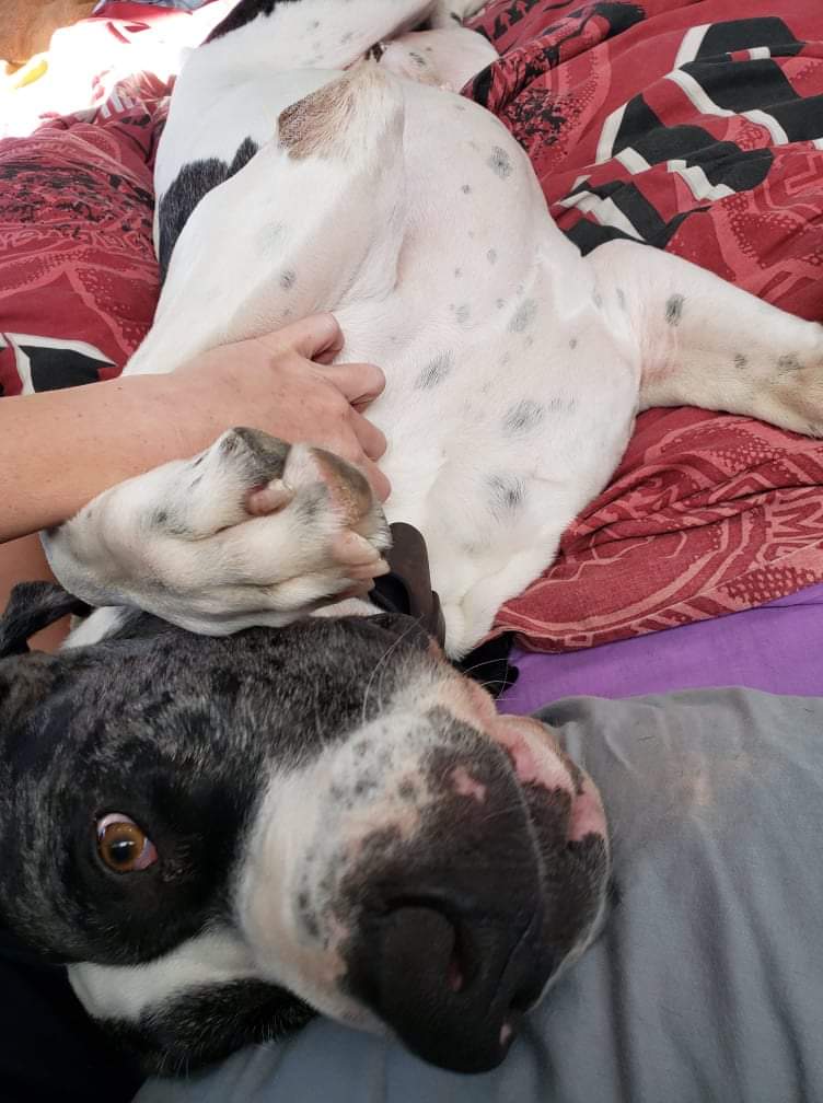 He walks well on lead, listens and responds to his name quickly too! Dozer is quiet but alert around the house, especially when a crumb hits the floor 🤣Did we mention this big boy forgets his size sometimes and thinks it is absolutely acceptable to be a lap dog 🥰🤣 He is a goofy and playful guy with nothing but laughs and love to give. His forever family's life will be filled with joy and love 💕