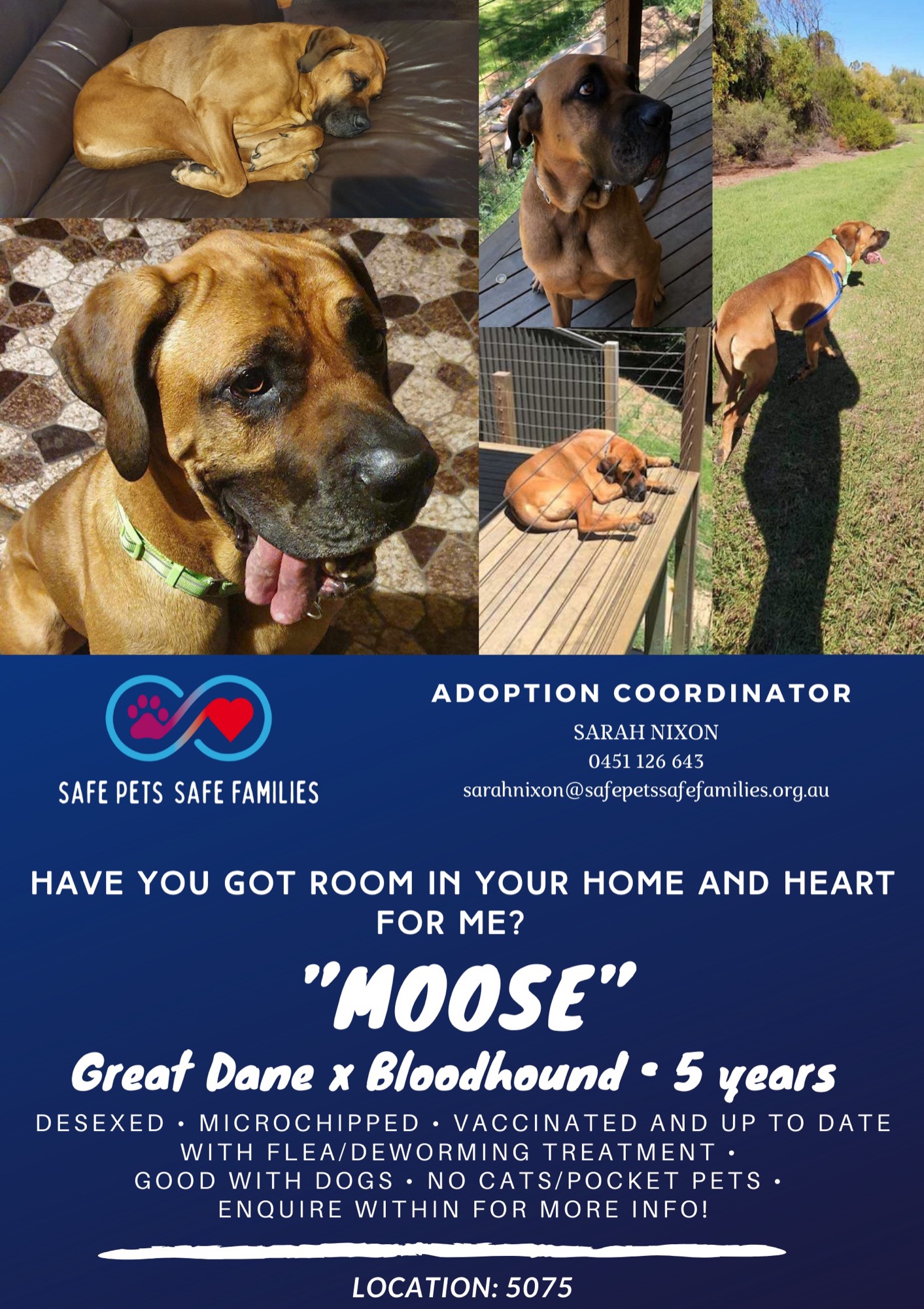 If you’re interested in being Moose’s new family, please contact Sarah (Adoption Coordinator) on 0451 126 643 & leave a text or voicemail if unanswered. Alternatively, email sarahnixon@safepetssafefamilies.org.au.