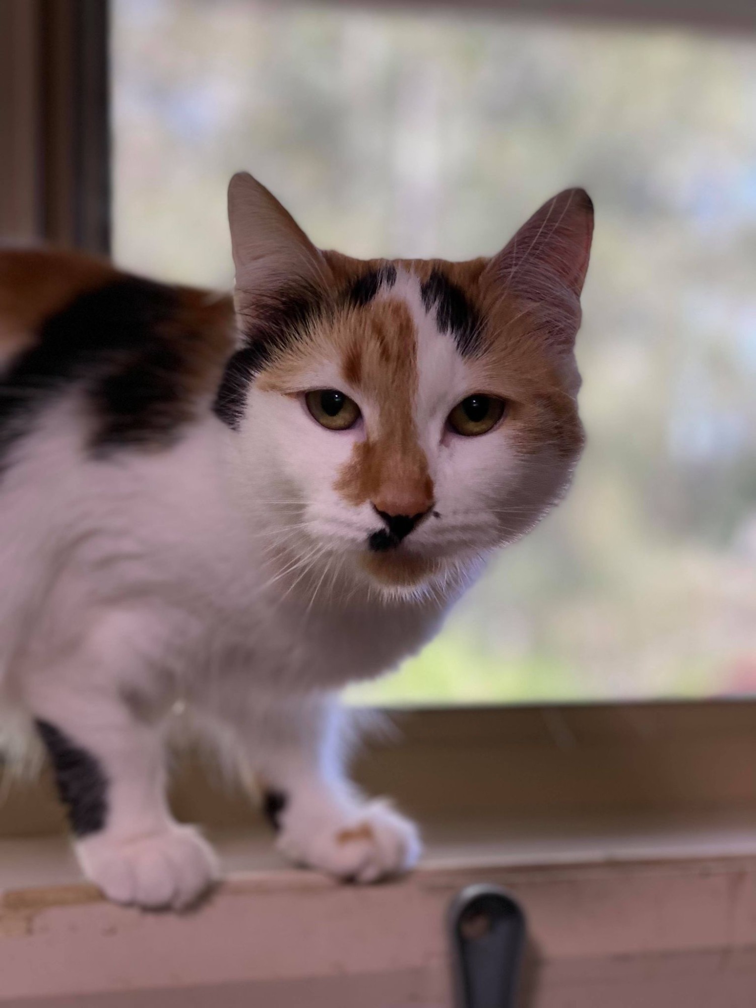 IMP 28 "EVIE". Evie is a beautiful 1 year old calico DMH girl who came in to us as a stray. She is a smoochy girl who does love affection, is cat social however also enjoys her own space. She is quiet and keeps her cage very clean. Her Adoption fee is $200 which includes her de sexing, microchipping, vaccination. worm and flea treatment and Registration. If you are interested in adopting Evie please call us on 65833488.